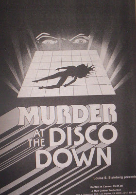 The promotional artwork shows a pair of menacing eyes looking down at the naked body of a woman silhouetted on an illuminated disco dancefloor. Which, visually, at least hints that the film was going to be a cash-in on both the disco and the slasher craze. It lists it as ”Louise E. Steinberg presents” – but whoever she was is lost to the mists of time as is MURDER AT THE DISCO DOWN. The project presumably failed to find enough backers at Cannes (surprisingly so given its 1979 date), so the beat was sadly snuffed out at the Disco Down.