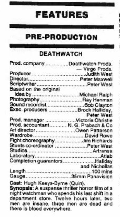 DEATHWATCH was due to star actor Hugh Keays-Byrne. He is probably best remembered for his role as Toecutter in MAD MAX (1979), but had also appeared in the same year's SNAPSHOT as a photographer with a macabre fascination (the film that was infamously - and misleadingly - retro-packaged as a sequel to John Carpenter's HALLOWEEN (1978)). No film in Keays-Bryne's filmography matches the description of DEATHWATCH. However, the project went unproduced until it morphed into what was eventually released as DANGEROUS GAME in 1988. DEATHWATCH and DANGEROUS GAME shared several elements, including the same screenwriter (Peter West), producer (Judith West) and production company (Virgo Productions). DANGEROUS GAME was co-directed by Stephen Hopkins just before he took the mantle for high profile horror sequels A NIGHTMARE ON ELM STREET: THE DREAM CHILD (1989) and PREDATOR 2 (1990). Somewhat ironically, the plot had changed (while the setting remained) to teens being menaced by a psycho policeman in a mall; which was far more typical of early 1980s slashers than the original 1982 synopsis. Comparisons were also made to DIE HARD, although that may have simply been co-incidental as they were both released the same year.