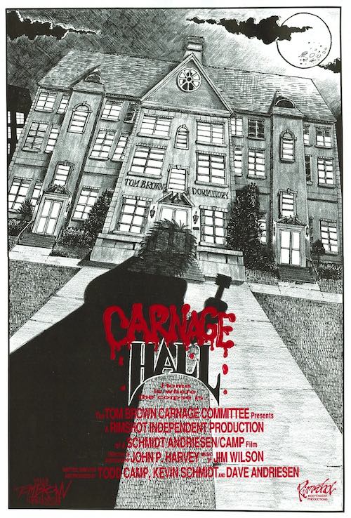 Many of us lucky enough to be teenagers in the latter part of the 1980s made slasher movies with our friends on a parent’s hulking camcorder. Watched once to much amusement and never seen again, there was no thought of ever making them commercially available. However, we can trace CARNAGE HALL - and even its mooted sequel - to a late 1980s student production at Texas Christian University in Fort Worth, Texas. A synopsis exists on IMDB: “A mad killer is loose, preying on the residents of the coolest male dormitory ever.” The film was directed by student John Harvey and written by fellow students David Andriesen, Todd Camp and Kevin Schmidt - under the banner of Rimshot Productions. The four of them also appeared in the film and are listed as playing themselves. The group were part of the self-named ‘The Carnage Committee’; a horror film society in the Tom Brown Hall’s of residence, who told a local newspaper that after seeing 500 terror pics they could make a better one.