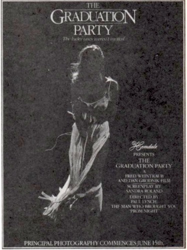 Starburst reported (presumably mistakenly) that THE GRADUATION PARTY had already started filming to avoid an upcoming director’s strike. They also said that it had the best poster at Cannes after CREEPSHOW (1982) with the familiar sounding tagline: “The lucky ones weren’t invited”. They also mentioned that Hemdale had accidentally stated in promotional materials that it was being directed by David – not Paul – Lynch!