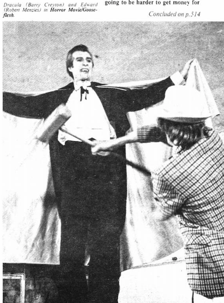 The same issue of The Cinema Papers lists another film GOOSE FLESH as being in production – with the exact same cast and crew – but with a slightly different synopsis: “A spoof on horror films past and present”. The website Tabula Rasa, under their ‘Killer Koala’ list of Australian horror movies has this entry: “Horror Movie (Maurice Murphy, 1981) aka Goose Flesh. PC: Universal Entertainment Corporation. A spoof in which a psychopath re-plays events depicted in various horror films.” What is odd is that HORROR MOVIE sounds like a straight slasher flick – whereas GOOSE FLESH was intended as a parody. So which was it? Well, director Maurice Murphy claimed in Famous Monsters Magazine (189) that they were two different films – with HORROR MOVIE “soon-to-be-completed” and GOOSE FLESH up next. “They’d make a really good double bill at a drive-in”, he claimed.