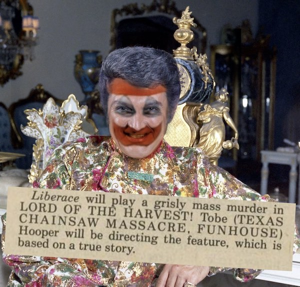 Although the mind boggles at the thought of Liberace going full nutzoid in Pogo the Clown makeup, the project was publicly nixed by the flamboyant star himself in July 1982. Several newspapers reported: “Liberace mad? Yes, he is. In fact, Lee and his long-time manager were thinking of suing every single one of us ink-stained wretches who fell for the charming rumor that he might play a homosexual murderer in a future film for director Tobe Hooper. … Liberace says he would never do such a role. His manager says he’d never let him. Both say that no such proposition has come their way in any case, and they hope it never does.”