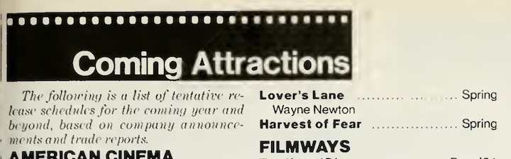 This Australian film was listed as in production (as opposed to pre-production) in the trade journal The Cinema Papers in its May/June 1981 issue. The plot certainly sounded like it was intended as a slasher movie: “A psychopath, enthralled by horror films, emulates what he sees on the screen. The dramatic climax is a night of horror at a drive-in cinema.” What is especially intriguing about this entry is the fact that the coverage lists everything from its budget ($500,000) to its length (90 minutes) to director (Maurice Murphy) to cast (Drew Forsythe as Vincent and six other roles – including the debut role for actress Joy Smithers) to production company (Universal Entertainment) to even the caterers and where the film was mixed! However, this film is not listed on IMDB.