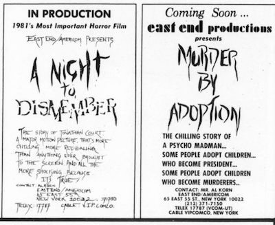 A strange title and something of an enigma. MURDER BY ADOPTION got a single mention as an upcoming project in an advert in an issue of Variety (March 1981). A reason to take notice is that it was one of two upcoming horror projects by East End Productions, who had been involved with William Lustig's MANIAC (1980) - and who were crowing about its box office success in a full page advert in the movie industry magazine. However, it is worth noting that East End Productions did not produce MANIAC, but did provide post-production services with the company's Lorenzo Marinelli editing it. However, the financial success of Lustig's film appears to have motivated East End Productions - and Marinelli - to get their own slice of the slasher movie pie.