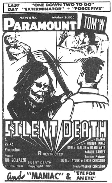 SILENT DEATH was shot in May and June of 1982 in Elizabeth, Union and Freehold, New Jersey by director Vaughn Christion. One of the very few people to actually see the movie was Gore Gazette’s Rick Sullivan during its week-long run at the Paramount Theater in Newark, New Jersey on February 18th 1983. He said: "An almost unwatchable slasher/black exploitation/police drama about a masked assailant who is carving up members of an organized crime ring with a straight razor." He called it “… a 69 minute sub-Z abomination … [with] … constantly out of focus camera, inaudible sound and cheesy looking orange blood.”