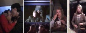 naturally she follows meekly pleading to the dark, "Don, is that you? … Please answer me Don!" … Well, Don makes an appearance, swinging in, hung upside down from a tree- throat slit. Also making an appearance from off the screen looms a psycho with a ladies stocking pulled tight over his face, a hand scythe firmly gripped and raised above his head. … Now, it's at this point the camera reveals that we're watching a slasher flick unfold in a darkened cinema auditorium. Two young women sit huddled in their seats, one turns to the other and pleads, "I can't take this anymore", before stropping off to the bathroom leaving the other girl transfixed on the cheesy action unfolding on the screen in front of her. Down in the bathroom the spooked girl adjusts her hair in the mirror and glances down and smiles a little at the ring on her index finger. She shuts herself in a cubicle and sits down, but before too long she starts to get spooked again, thinking she can hear some noise, asking through the door, "Is there anybody there?". Eventually she creeps out of the bathroom and, after bumping into another patron, lets herself back into the auditorium. Taking her seat her friend, eyes still transfixed on the screen says to her, "Where have you been?! This is great!"; in