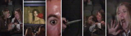 return she just meekly says, "Somebody's following me." … Unbeknownst to both of them, just as the final girl in the film within the film finds herself besieged by the killer, a man sidles down the row behind them and takes a seat directly behind the petrified girl. As the action on the screen reaches a crescendo the man pulls out a knife and pushes it through the back of the girl's chair, she slumps over onto her friend- dead, and the man sneaks off into the dark. Her friend tries to reassure her its all over and she can stop hiding now, but realises things aren't quite what they seem when she pulls her hand away- cover in blood. Cue piercing scream…